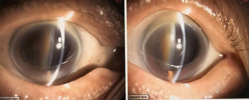 齐卫主任接诊后,为苑奶奶进行了全面检查。由于老人听力严重下降(耳背),医患沟通与指令配合存在不小挑战。全面评估后发现,病情极为复杂:老人白内障已进展至晚期,晶体核呈棕褐色硬核、质地坚硬,混浊的晶体完全遮挡视线,使得眼底状况难以预判。加之94岁高龄带来的身体机能整体衰退,手术风险显著增加。