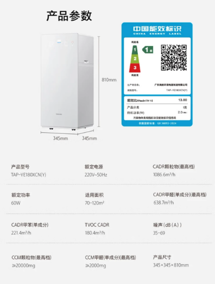 净化数据:颗粒物CADR 709m³/h、CCM达P4级,H13 HEPA过滤效率99.97%,TVOC去除率95%+,纯物理净化无臭氧。
